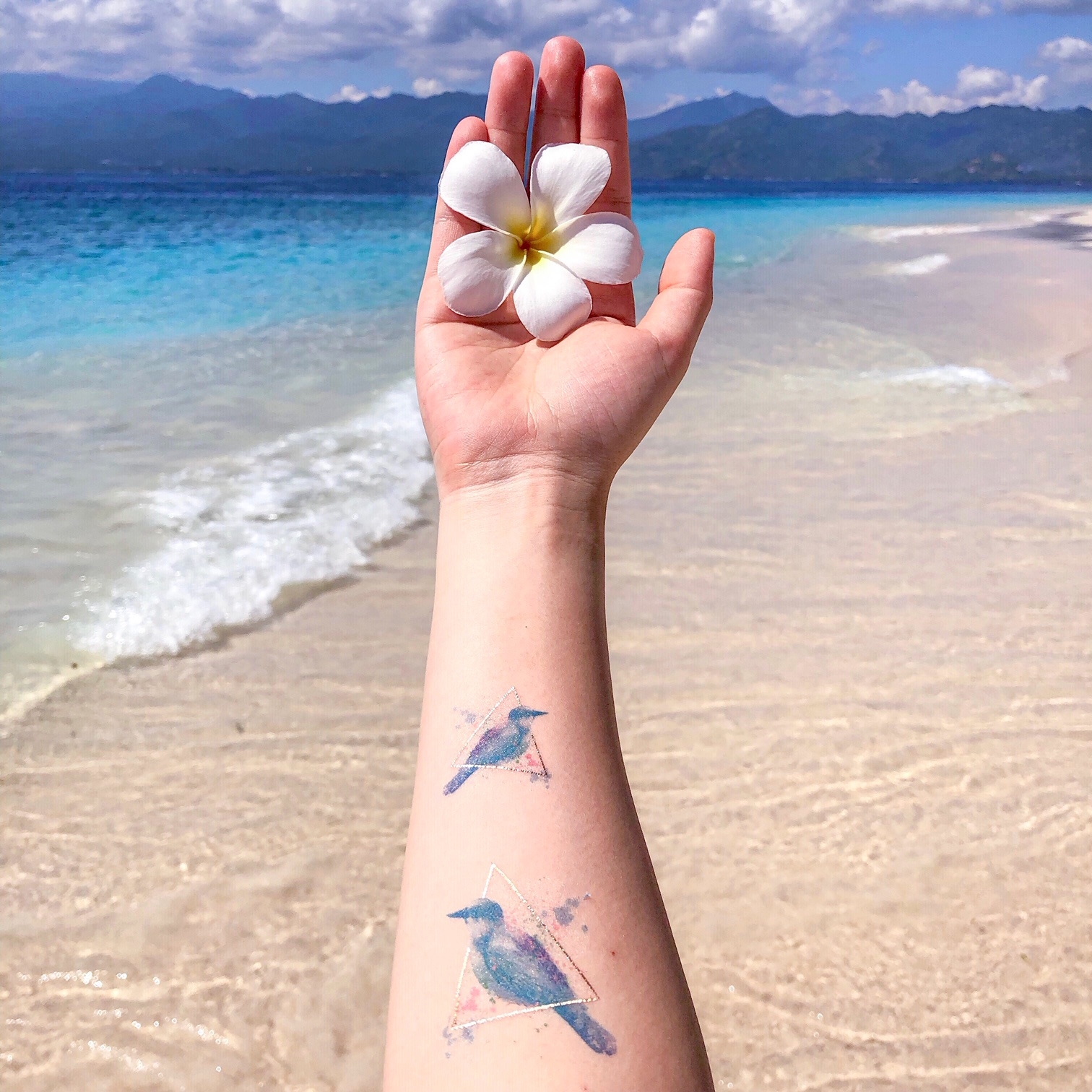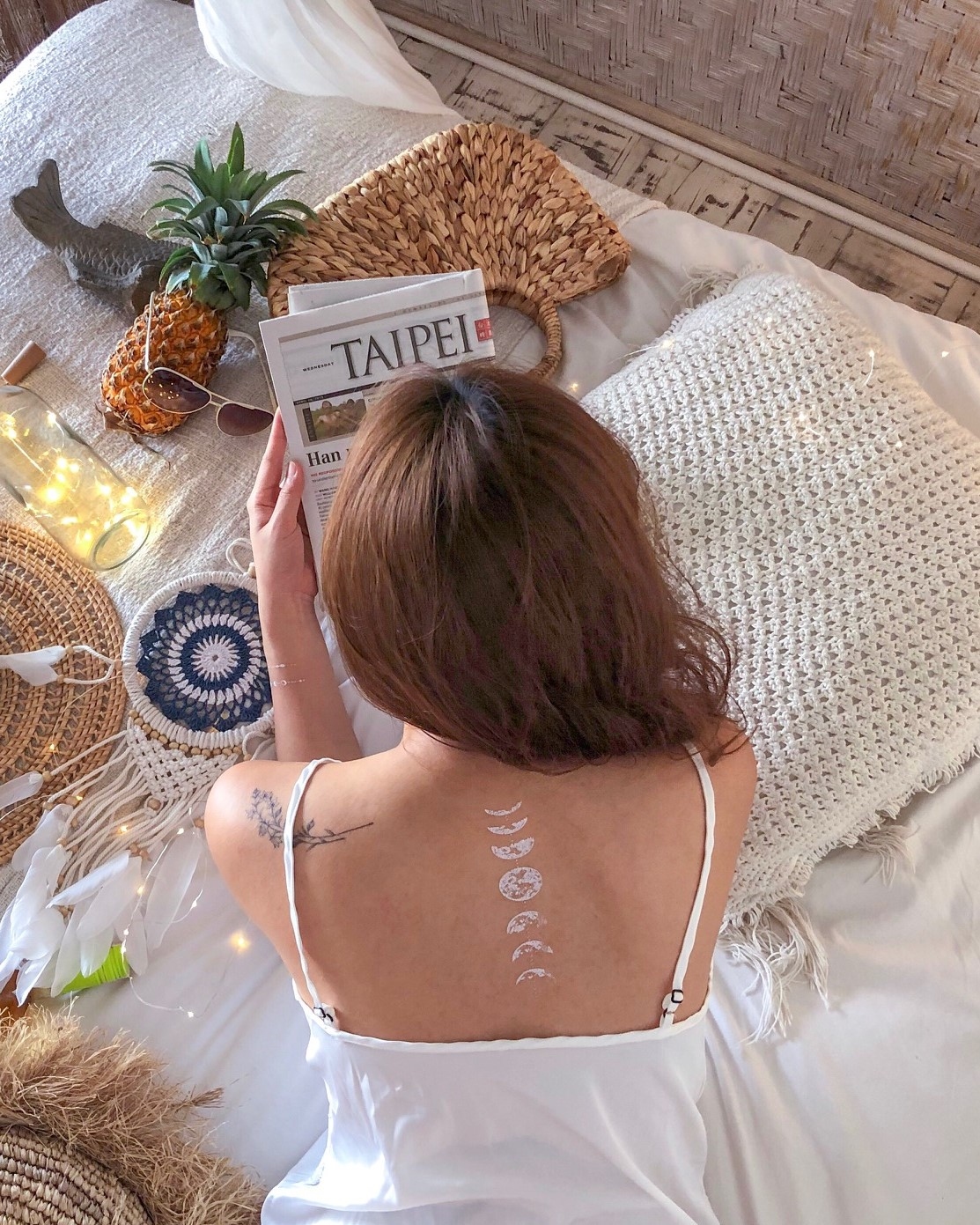 如果不想臉入境,卻又很想有一系列度假美照,背部與手是最適合的,背部請男友或好友幫忙貼與卸,因為卸除使用卸妝油/嬰兒油即可,也不會耗費旅程太多時間。