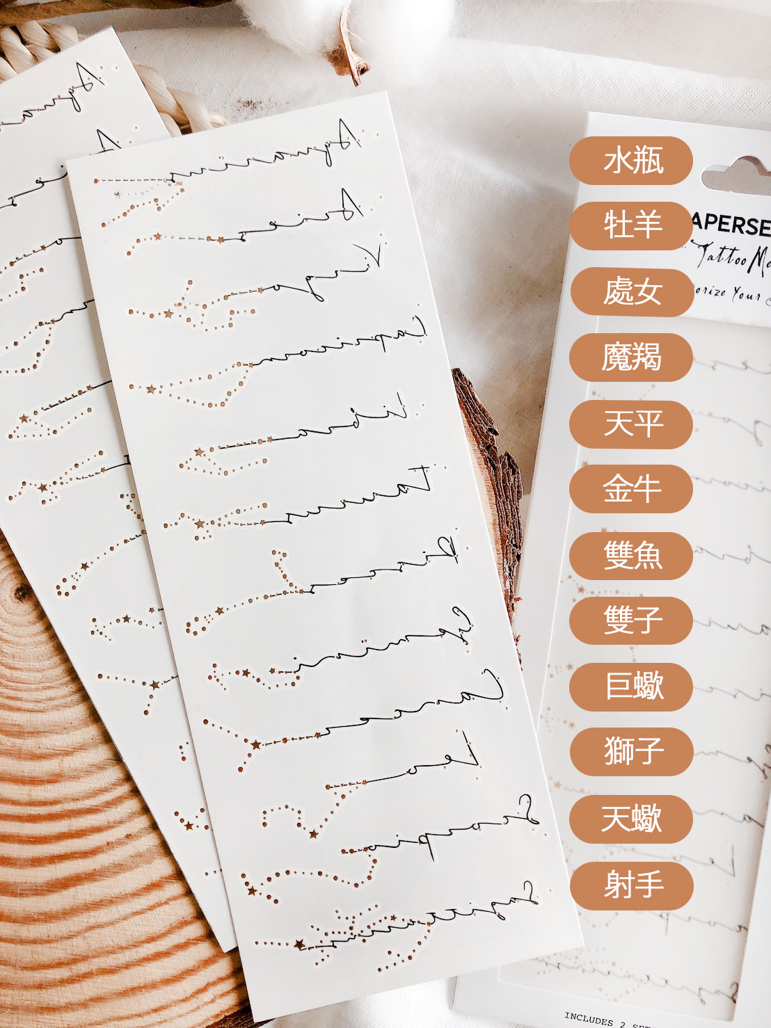 藝術家Dominique Tasmin使用的就是這款刺青,星座文字分別為十二星座英文字搭配星座圖,燙金點綴圖騰,讓文字不再單調而帶有個性感,作為日常搭配也很適合唷!好幾次都被誤會真的跑去刺青~~~