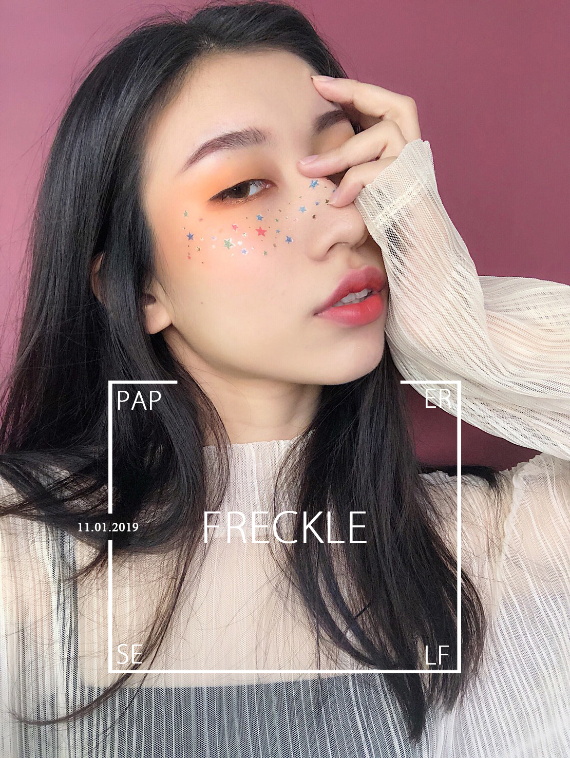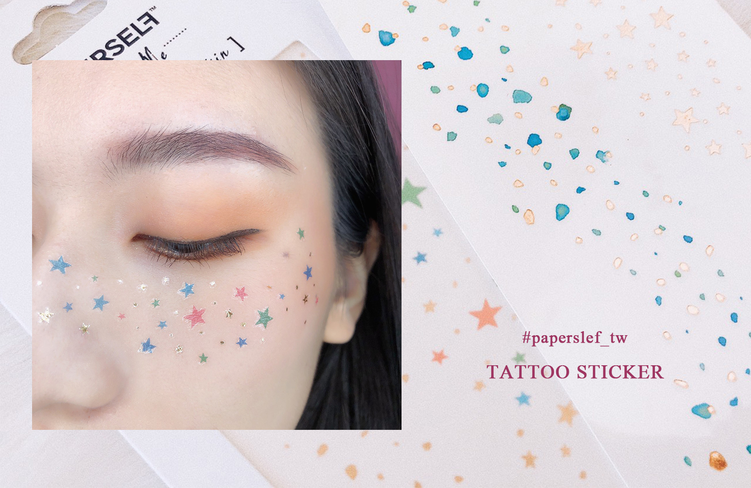 這次選擇雀斑小姐融合妝容,其實一包裡面有4種不同的雀斑,顏色分別為「燙金」、「彩色」,圖案有兩種「星星」、「點點」,幾乎你想的到的妝容風格都可以搭配,4種不同樣式集結一包,有夠超值(照片中的款式是彩色星星)。