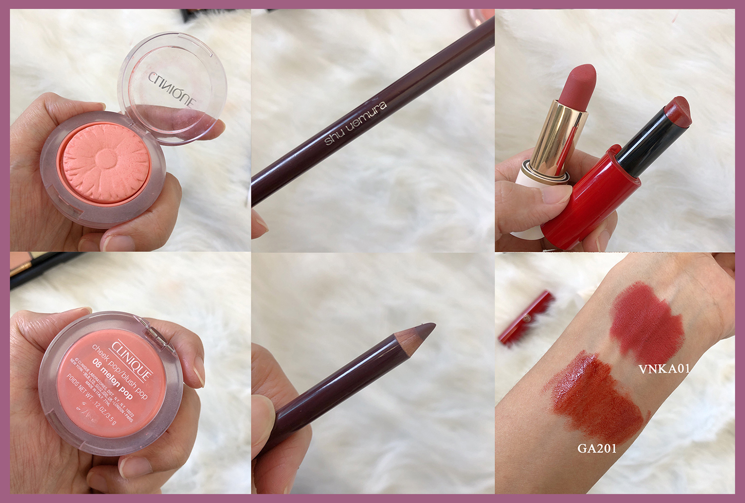 【唇部】先上左邊VNK秋季藝術館(色號A01),再上右邊的GA緞光水唇膏(色號201)