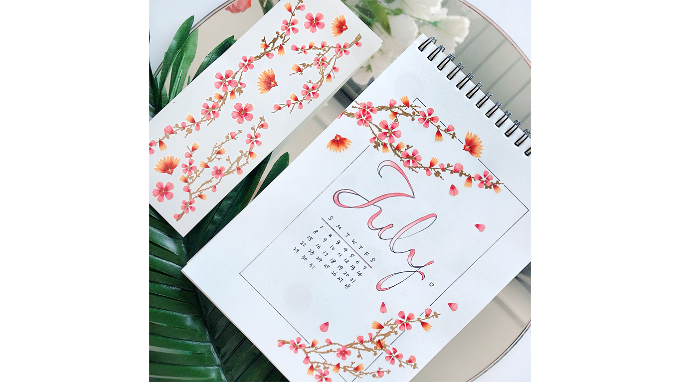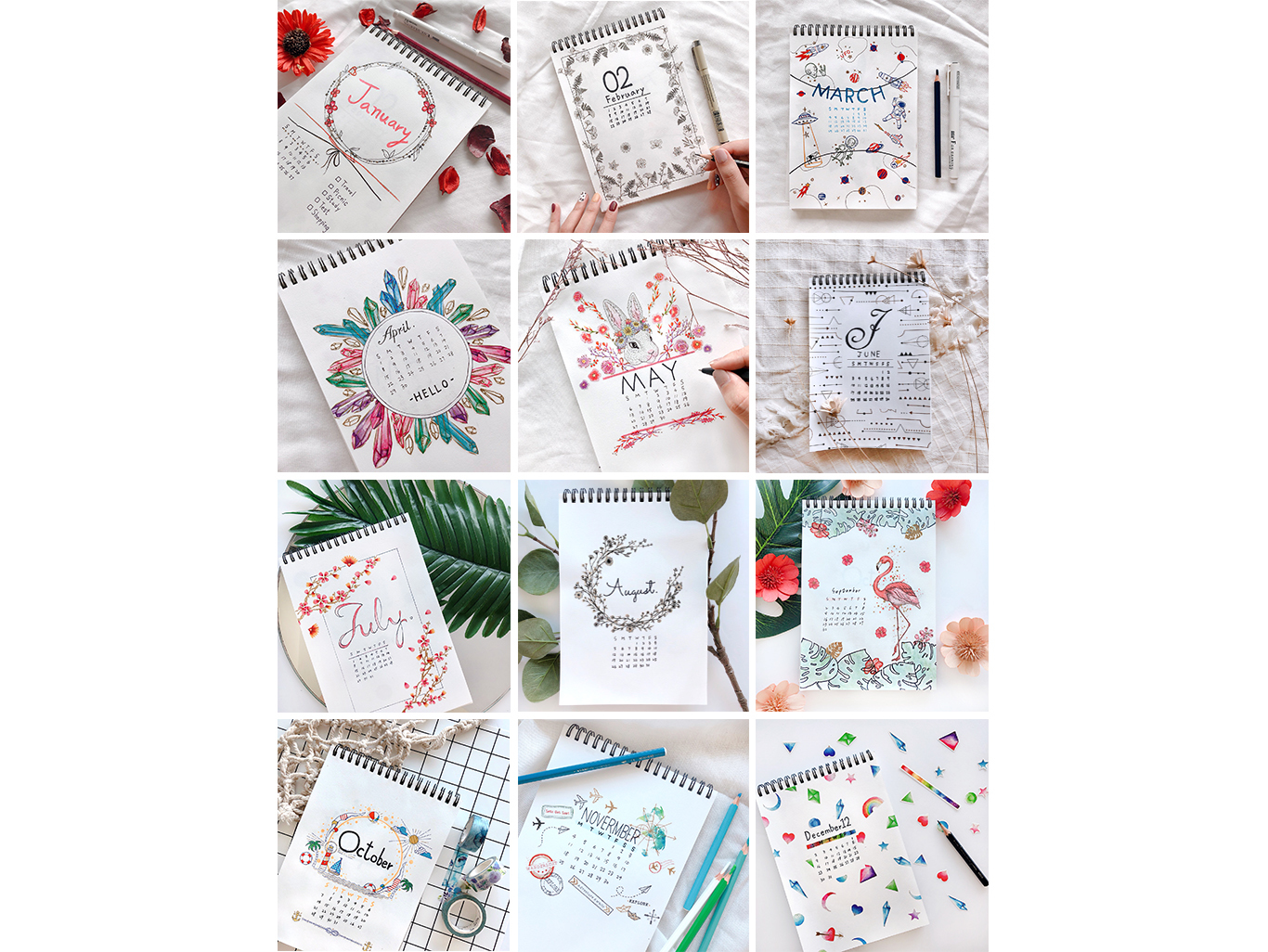 回顧所有月份,有6個月份以滿版為概念設計 ( 2 , 3 , 6 , 7 , 9 , 12 ) ,不留邊為原則,圖案的之間保留空隙取決設計者想要的感覺;