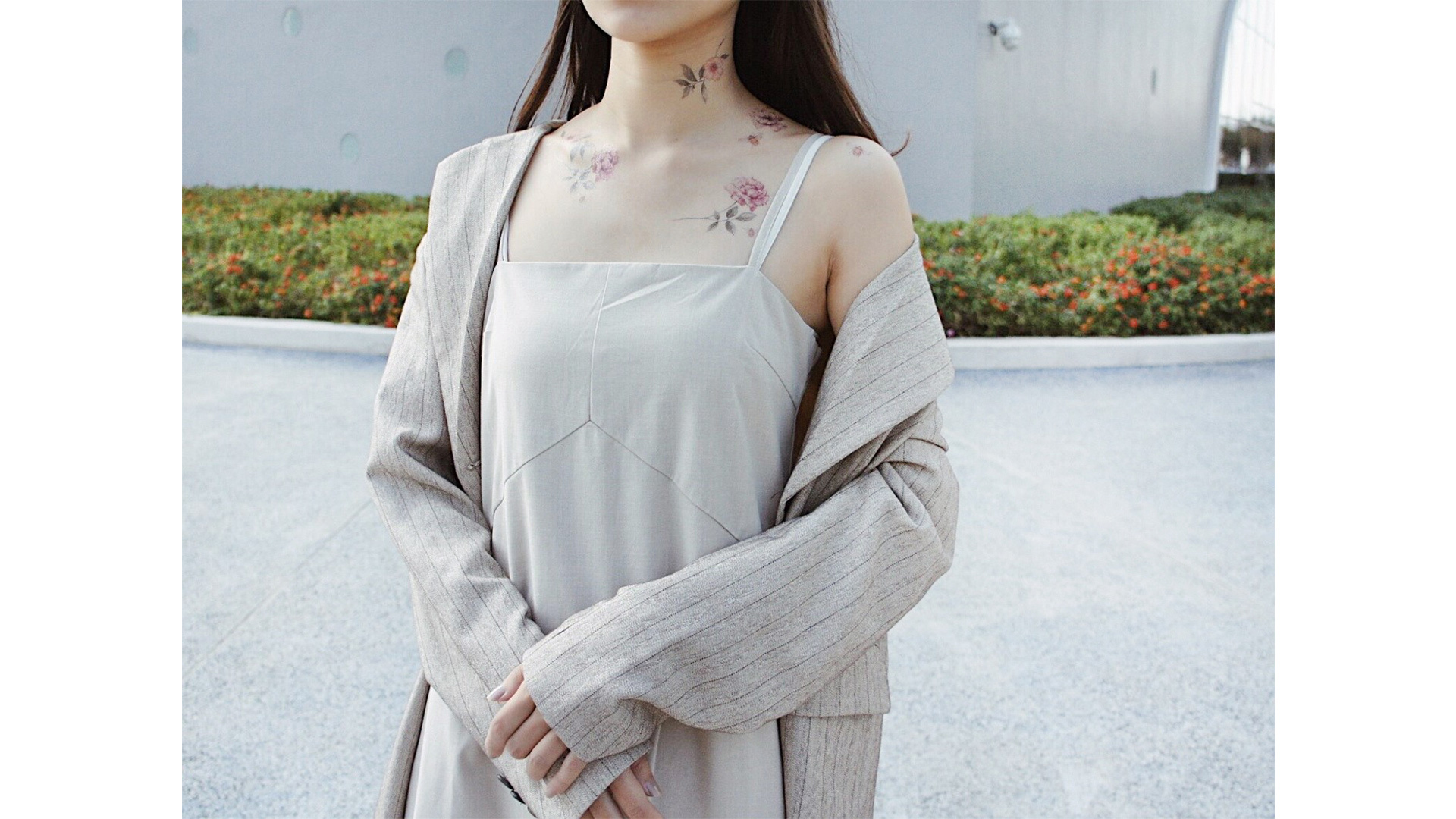 有人說西裝或是成套的衣服很難駕馭,因為穿起來太正式或容易剪裁不合身,其實不一定要穿整套,可以單穿西裝外套配上同色系的裙裝,也可以營造時髦感。試試看加上刺青貼紙,更能吸引目光,成為全場焦點!