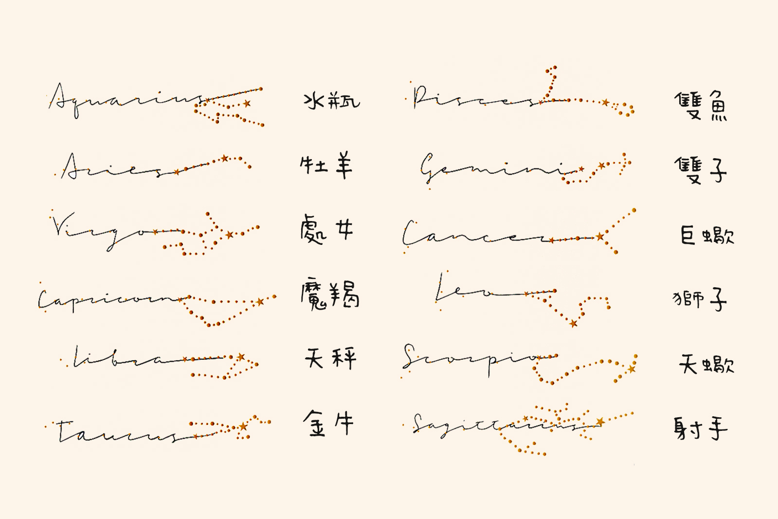 ♡分別為十二星座英文字搭配星座圖,呈現與市面上不同的設計