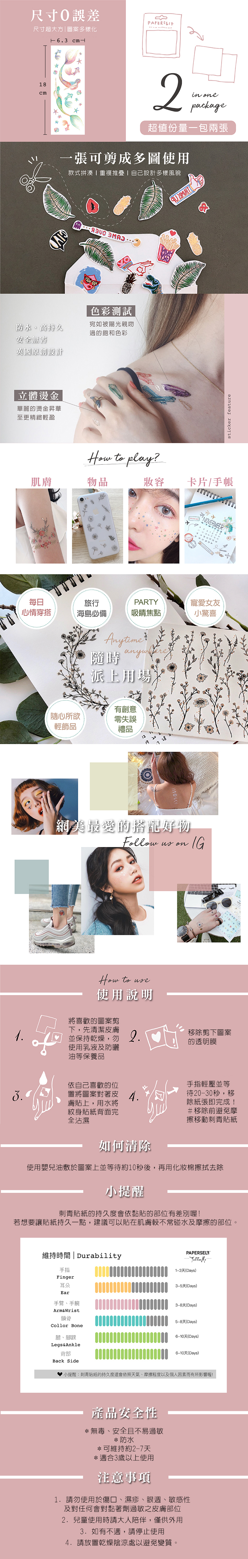 PAPERSELF的刺青貼紙十分重視色彩的運用以及細膩的細節,在多彩飽和的色彩基準上加入與市面不同的金、銀質鑲邊更加襯托出圖騰的質感,經過無數個環節的完美組合,成就了這些小而精緻的時尚藝術,給正在找尋獨有個人風格特別的妳。