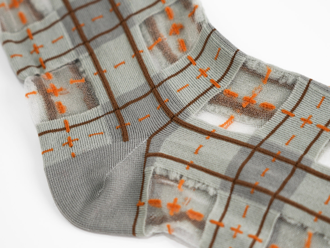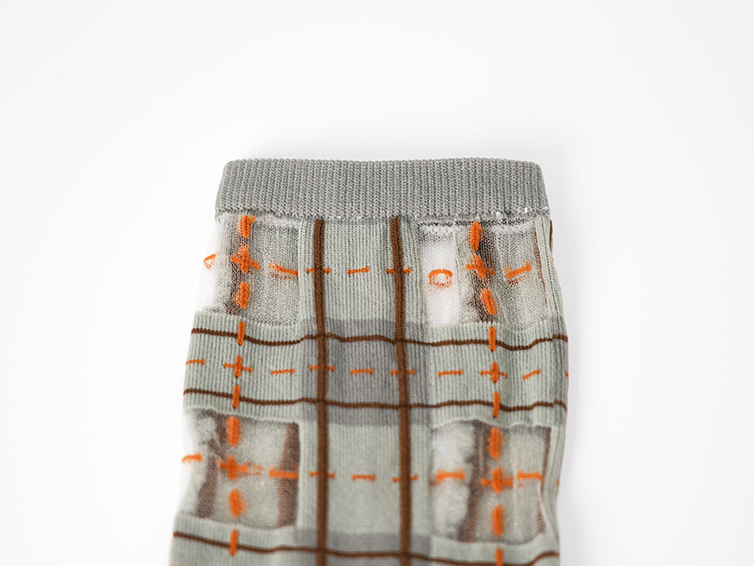 與台灣半甲經驗的傳統織襪廠商溝通製作,設計-產出長達兩年,對品質與設計的要求反覆修改,考慮不同腳型和舒適度的需求,材質使用手感柔軟的細單絲尼龍「顏色交錯、手工修線」從腳尖腳跟每一個小細節都不妥協,希望提供品質好、獨創性高的 sheer socks 透紗襪。