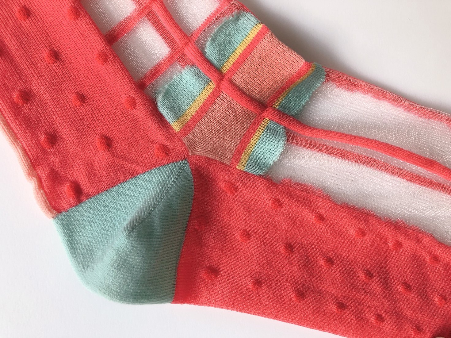 與台灣半甲經驗的傳統織襪廠商溝通製作,設計-產出長達兩年,對品質與設計的要求反覆修改,考慮不同腳型和舒適度的需求,材質使用手感柔軟的細單絲尼龍「顏色交錯、手工修線」從腳尖腳跟每一個小細節都不妥協,希望提供品質好、獨創性高的 sheer socks 透紗襪。
